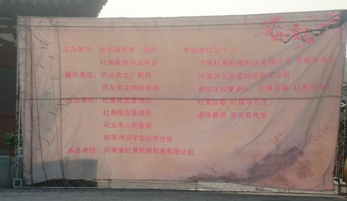 201444日清晨,由我公司-河南省杜甫機械制造有限公司為承辦單位的“第二屆清明文化節祭拜詩圣杜甫典禮”在鞏義市站街鎮杜甫故里紀念館中隆重舉行。此次祭拜詩圣典禮是繼2013年后的第二屆祭拜詩圣活動。是由站街鎮黨委、政府以及杜甫故里詩詞學會主辦,杜甫故里管理所等單位協辦的。