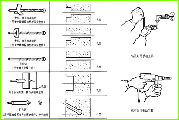 2 、擴孔鉆的形狀如下圖所示,一般可工地自制,用Φ14 ~16 鋼筋一端用火燒紅后打扁,然后兩邊向反方向打彎,斷面呈S 形開刃后即可。另一端用銑床銑出插口,插入電鉆即可使用,其使用方法是,進入墻體為直孔,到底后將鉆頭桿繞孔轉動,底部即成擴孔??淄鈴揭话銥?/span>035 、叨.孔頭約為中60 、65 ,這要視預埋件大小而定。深度應)100 (如吊掛物較重可適當加大深度)打入時與墻體呈45 度角,用水沖凈孔內渣末,灌聚合物水泥砂漿,插入鐵件。
