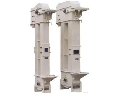 利用均勻固接于無端牽引構件上的一系列料斗,豎向提升物料的連續輸送機械。牽引構件環繞在頂輪和底輪間。頂 輪和驅動裝置相聯。底輪設有張緊裝置,以保證牽引構件運行平穩。從底部加入機內的物料,被各料斗依次挖取并提升至頂部卸出。由于結構簡單,機身橫截面尺寸小,密封性好,因此,廣泛用于豎向或大傾角輸送散粒物料。缺點是料斗及牽引構件易磨損,荷載波動敏感性大,須均勻給料。