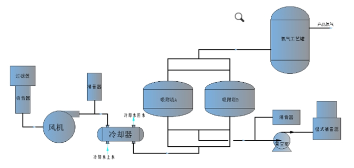 VPSA真空變壓吸附制氧工系統主要由鼓風機、真空泵、切換閥、吸附塔和氧氣緩沖罐組成。原料空氣經吸入口過濾器除掉灰塵顆粒后,被羅茨鼓風機增壓后進入其中一只吸附器內。吸附器內裝填吸附劑,其中水分、二氧化碳、及少量其它氣體組分在吸附器入口處被底部的活性氧化鋁所吸附,氮氣被上部的沸石分子篩所吸附。而氧氣(包括氬氣)為非吸附組分從吸附器頂部出口處作為產品氣排至氧氣緩沖罐。